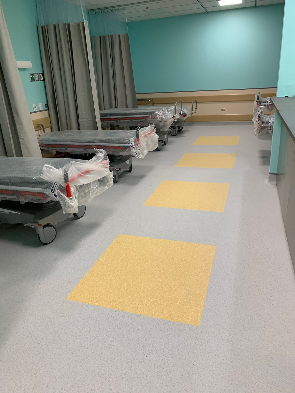 Para este proyecto la arquitecta atinadamente decidió utilizar varios tipos de nuestros productos : barrera de vapor anti Humedad marca MAPEI para controlar la humedad que sube desde el subsuelo a la superficie a través de la capilaridad del concreto, adhesivo MAPEI, Piso Homogéneo Mipolam Affinity de GERFLOR para las zonas de consultorios y espera con un diseño muy moderno y atractivo. En la zona de atención de pacientes se seleccionó el piso deportivo Taraflex de 7.5 mm de espesor, el cual por su absorción al impacto, tratamiento anti hongos y anti bacterias, resulta ideal para la atención y tratamiento de pacientes que necesiten fisioterapia, además que permite realizar diseños muy dinámicos y estimulantes. Las paredes están recubiertas por nuestras láminas de PVC rígido DECOCHOC, las cuales protegen de golpes, rayaduras y demás posibles daños, evitando así tener que estar haciendo reparaciones y / o pintándolas frecuentemente, además de ser materiales anti bacterias y antihongos, acompañadas de nuestros esquineros y rodapié de 6 Pulgadas de alto, que complementan muy bien con los productos ya citados.