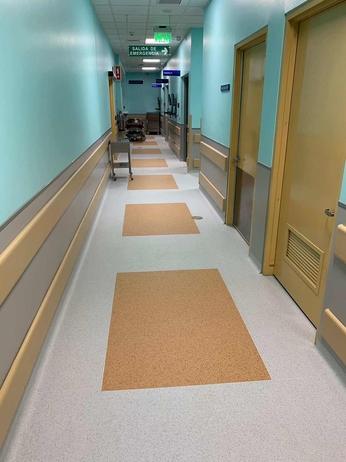 En este proyecto el cliente escogió el piso homogéneo hospitalario Mipolam SYMBIOS de GERFLOR que tiene un 25% de Material RECICLADO entre sus múltiples prestaciones podemos resaltar : altísima resistencia al tráfico, facilidad de limpieza debido a su tratamiento antibacterial de superficie EVERCARE, variedad de colores, resistencia a sustancias químicas, versatilidad para realizar diseños, propiedades antiestáticas y muchas otras mas, también en las fotos podemos apreciar Bumpers de la línea IMPACT, Pasamanos StarLINE y Esquineros SPM todos marca GERFLOR, así como piso de Hule antideslizante COLORSCAPE de Mannington en las gradas y otras en áreas y protectores de Pared DECOCHOC.